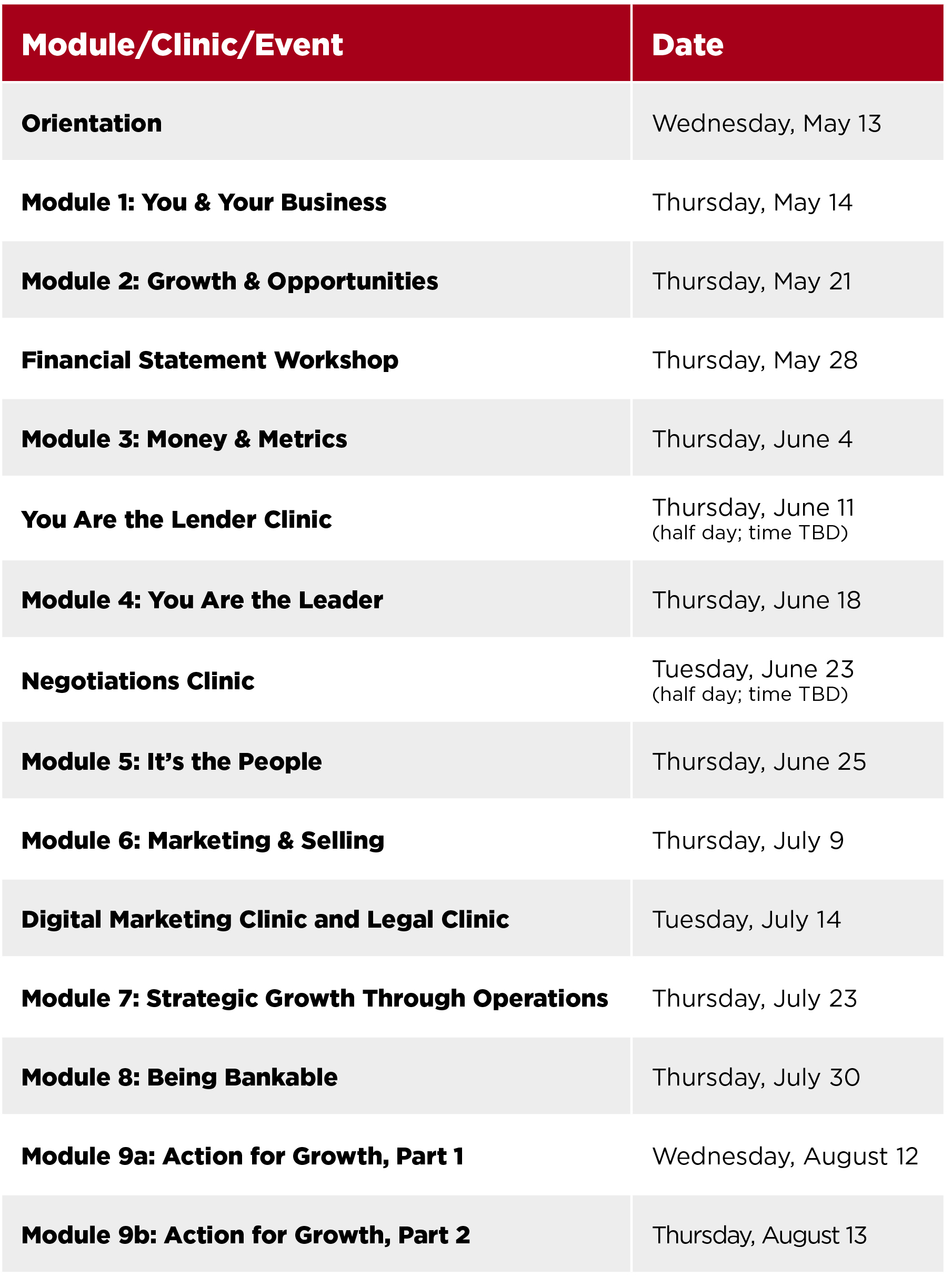 In addition to the classroom experience, participants must also complete eight to ten hours of out-of-class activities each week. These assignments are an integral part of the program and are designed to help you improve your business while enabling you to fully develop your business growth plans. The additional time commitment outside of class will include:
